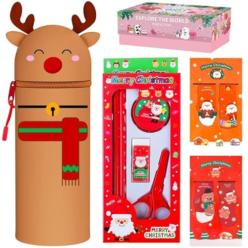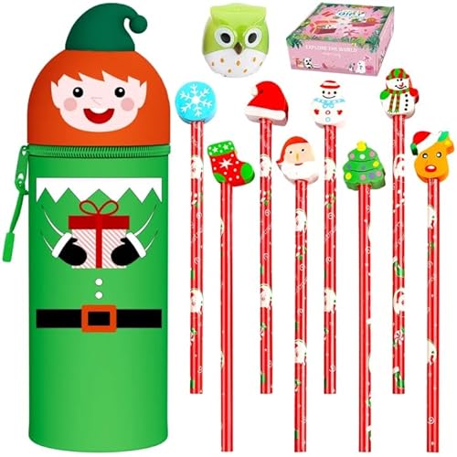 • GDFJBG Weihnachts 2-in-1 Silikon Federmäppchen Set, Schreibwaren Set, Radiergummi, Anspitzer, Mini Notizblöcke, Bleistift, Kleinigkeiten, Weihnachten Party Geschenke Bag Fillers