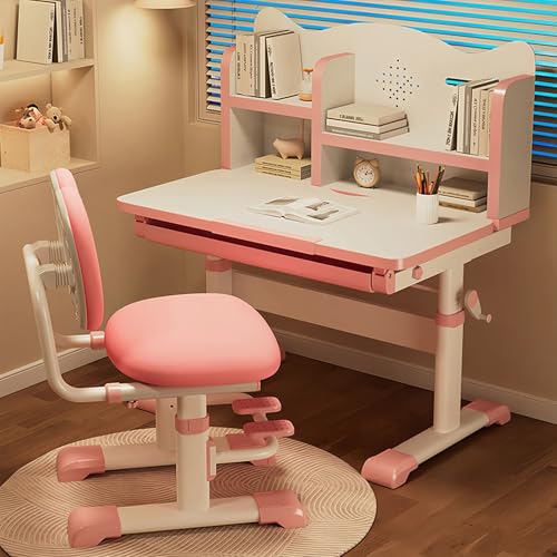 • XDCXYD Kinderschreibtisch- Und Stuhlset Mit Manuell Höhenverstellbarem Schreibtisch Großer Tischplatte Und Geeignet Für Das Lernen Zu Hause(White+Pink,80 * 50cm)