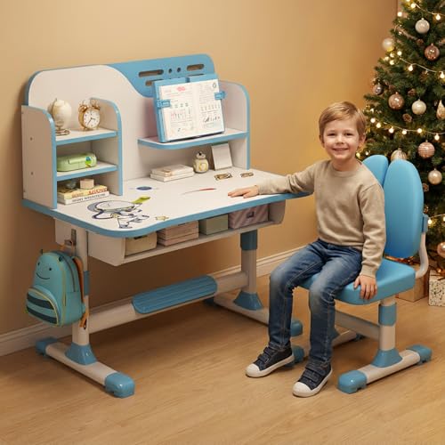 • Autrfso Kinderschreibtisch und Stuhl-Set, höhenverstellbar, Kinderschreibtisch mit Bücherregalen und Schublade, Augenschutz, Sichtdistanz, Kinderschreibtische für Jungen, Geschenk, Blau