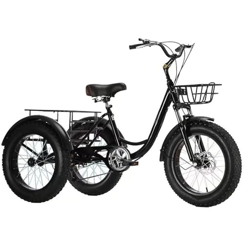 • LSQXSS Lastendreirad mit großem Korb für Erwachsene, 20×4-Fatbike-Reifen, 3 Räder mit Vorderradfederung, 7-Gang-Schaltung, Scheibenbremsen, Körben vorne und hinten, Verstellbarer Sitz