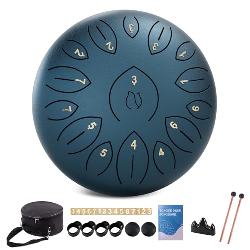 • Stahlzungentrommel 12 Zoll 15 Töne, Stahltrommeln für Kinder und Erwachsene, Handpan-Trommel mit Notenbuch, Trommelschlägeln und Tragetasche, Handpan C-Dur, Dunkelblau