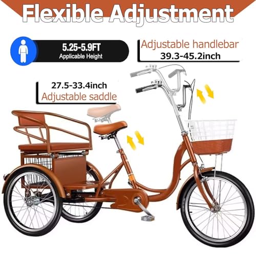 • Großzügige Abmessungen: Das 20-Zoll-Dreirad für Erwachsene ist aus hochwertigem Stahl gefertigt und verfügt über einen robusten Rahmen. Es eignet sich für Männer und Frauen mit einer Körpergröße von 1,57 m bis 1,75 m und hat eine maximale Traglast von 150 kg.