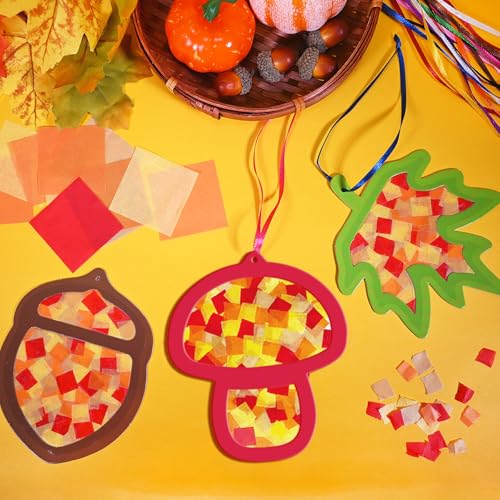 24 Stück Fensterbilder Herbst, Herbst Bastelset Kinder, DIY Herbstdeko mit 24 Fensterbilder, 24 PET-Aufkleber, 500 Konfetti, 24 Bunte Schnüre und 1 Schnur, Basteln Blätter & Acorn Decor