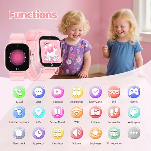 4G Smartwatch Kinder GPS, Kinderuhr mit 4G Videoanruf Voice Chat Schulmodus WiFi SOS Spiele Wecker Stoppuhr Schrittzähler Taschenrechner, Telefon Uhr für Mädchen Jungen 4-12 Jahren Geschenk, Rose