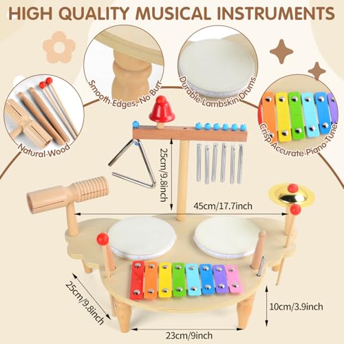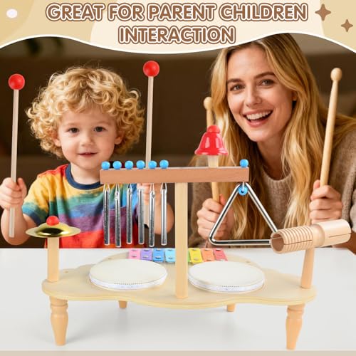 7-in-1 Montessori Schlagzeugset für Kinder ab 3 Jahr, Holz Musikinstrumente Set mit Xylophon, Trommel, Triangel & Glocken, Sensorisches Lernspielzeug Geschenk für Jungen Mädchen