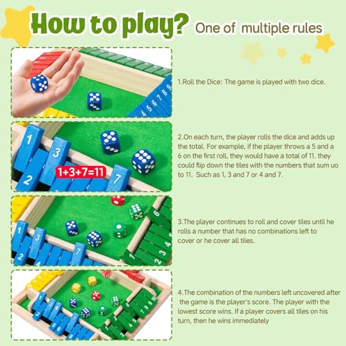 • 【Lernendes Spielzeug】 „Shut The Box“ ist mehr als nur ein Spiel – es stärkt Ihre mathematischen Fähigkeiten und strategisches Denken. Die Spieler werden die Herausforderung lieben, die Würfel zu werfen und gleichzeitig versuchen, alle Kästen zu schließen, was nicht nur Spaß macht, sondern auch ein geistiges Training bietet.