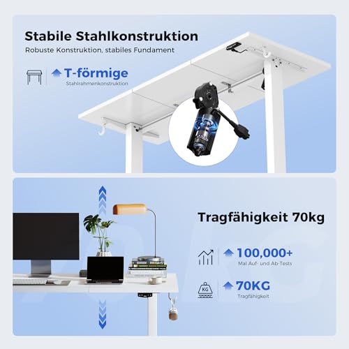 • 【Robuster Rahmen und langlebiger Motor】 Unser Stahlrahmen in Industriequalität und das T-förmige Rahmendesign sorgen dafür, dass dieser Sitz-Steh-Schreibtisch ein maximales Gewicht von 70 kg trägt. Gepaart mit einem Motor, der 50.000 internationale Hubtests bestanden hat, stellen Sie sicher, dass der Tisch über einen langen Zeitraum zuverlässig funktioniert.