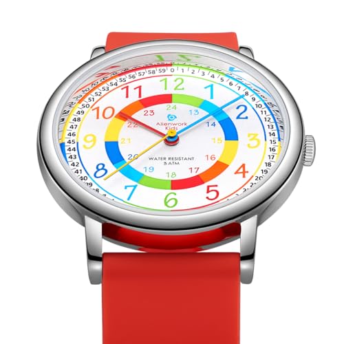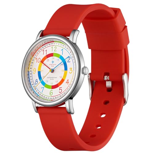 Alienwork Lernuhr Kinderuhr Mädchen Uhrzeit Lernen Silber Silikon-Armband Rot Mehrfarbig Kinder-Uhr Zeit Lernen Ultra-flach dünn