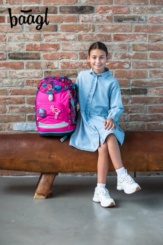 Baagl Schulranzen Mädchen Set 5 Teilig (Airy Plus Schultasche für 1. Klasse, Mäppchen, Turnbeutel, Schürze, Brustbeutel), Grundschule Ranzen, Ergonomischer Schulrucksack, 25 l (Flamingo)