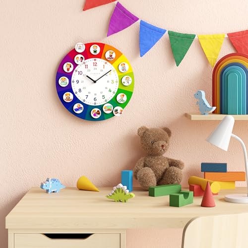 • Kiddus Kinder Wanduhr, Jungen und Mädchen, Analoger Lernuhr mit Zeitlernübungen, Kinderwanduhr Ohne Ticken, Kinderzimmer Lautlose, Schule, Uhrzeiger Deutsch