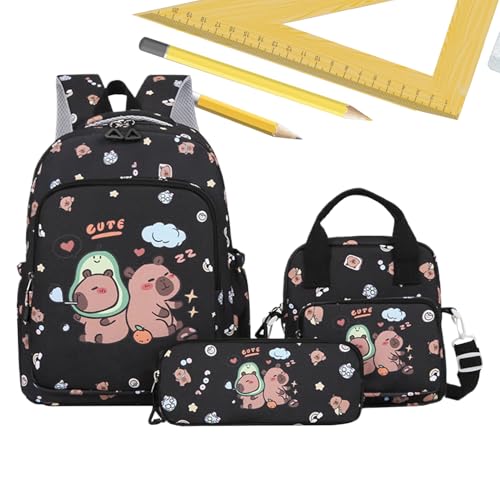 Capybara Rucksack mit – niedliches Büchertaschen-Set – niedlicher Mädchen-Reiserucksack für den täglichen Gebrauch mit Federmäppchen und Lunchtasche für Schule im Freien, Schwarz, Refer to