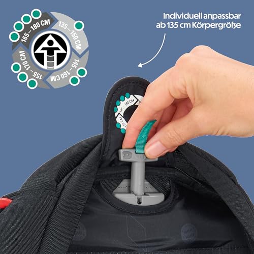 • ERGONOMIE – Das EASY GROW SYSTEM ermöglicht eine einfache, stufenlose Höhenverstellung der Schulterträger. Hüftgurt und Rückenpolster stehen für ergonomischen Tragekomfort.