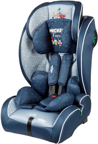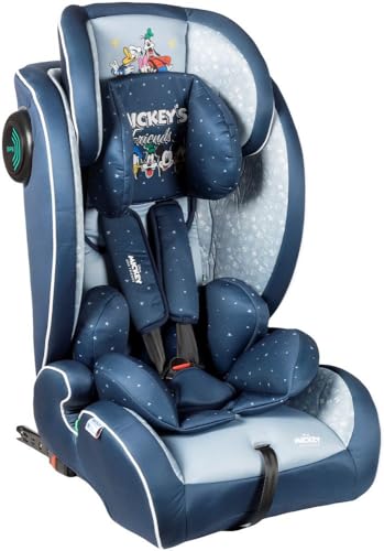 Disney Mickey Mouse Autositz mit ISOFIX Befestigung für Kindersicherung mit Höhe von 30 bis 59 Zoll mit Mickey Mouse, Minnie, Donald, Pluto und Goofy Grafik auf blauem Hintergrund