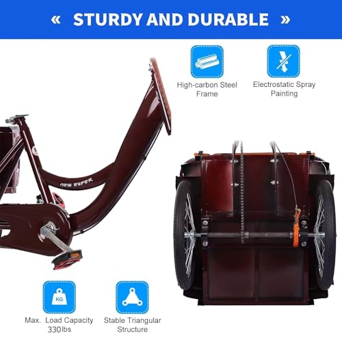 Das 20-Zoll-Dreirad für Erwachsene ist mit einem robusten Rahmen aus Kohlenstoffstahl und einer stabilen Dreieckskonstruktion ausgestattet und eignet sich daher für Männer und Frauen mit einer Körpergröße von 1,57 m bis 1,88 m. Die maximale Tragfähigkeit beträgt 150 kg (inkl. Fahrer und Gepäck).