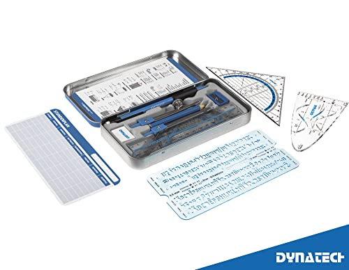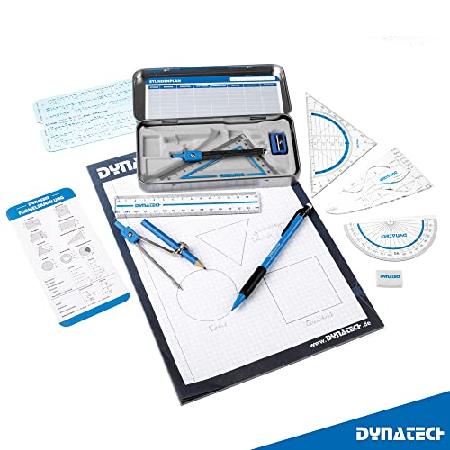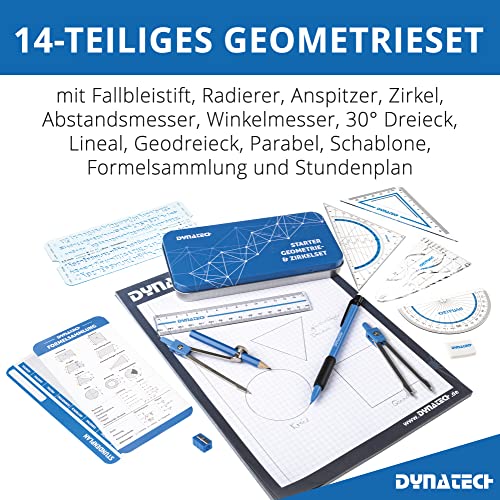 DynaTech Zirkel Set Geometrieset 14-Teilig – Starterset für die Grundschule – mit Zirkel, Geodreieck, Parabel, Bleistift, Lineal, Spitzer und Stundenplan in robuster Metallbox