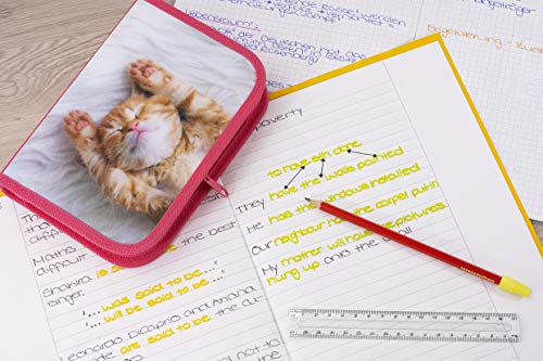 • Praktisches Stifteetui mit 42 Teilen befüllt zur sicheren Aufbewahrung von Schreibutensilien, mit einem niedlichen Kätzchen auf der Ober- und Unterseite, rosa Einfassung und einem robusten, rosafarbenen Reißverschluss