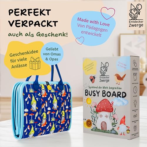 Entdecker Zwerge Busy Board ab 3 Jahre – Lernspielzeug mit Deutschen Inhalten – 25 Aktivitäten auf 10 Seiten – Motorikspielzeug – Reisespiel – in Geschenkbox