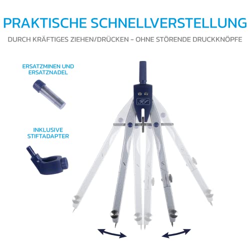 - PRAKTISCHE SCHNELLVERSTELLUNG – Unser Zirkel bietet eine praktische Schnellverstellung ohne störende Hebel sowie einen verstellbaren Schenkel. Mit dabei sind auch eine Ersatznadel und Ersatzminen!