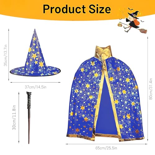 • 【3~12Jahre】Der wizard cape witch umhang mit hut ist 80cm lang, die Zauberermütze ist 35cm hoch und 37cm breit und passt den meisten Kindern im Alter von 3-12 Jahren und einer Größe von 90-140cm.