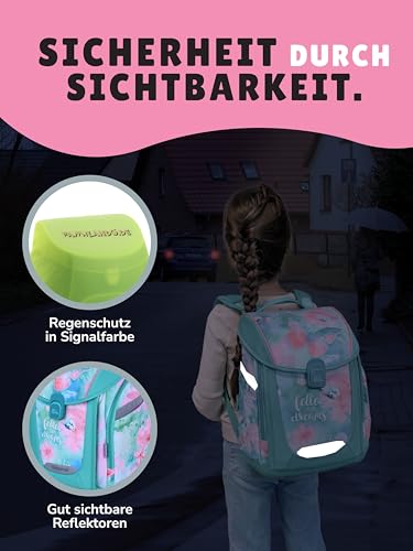 • Sorglos unterwegs, bei jedem Wetter – Durch den mitgelieferten Regenschutz in Signalfarbe und das wasserabweisende Material des Ranzens sind Bücher, Hefte und Stifte vor Nässe geschützt. Gut sichtbare Reflektoren sorgen zusätzlich für mehr Sicherheit bei schlechten Lichtverhältnissen und erhöhen die Sichtbarkeit im Straßenverkehr.