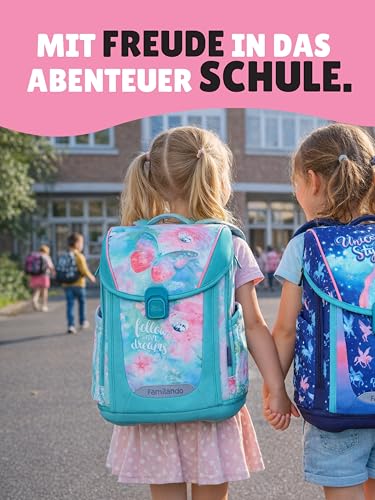 Familando – Premium Schulranzen Set – 9-teilig mit Lunch-Set – Butterfly (Schmetterlinge) – Ergonomisch, stabil & mit gepolstertem Rücken – 1000g – 20L Volumen – Mit Reflektoren – ab 1. Klasse