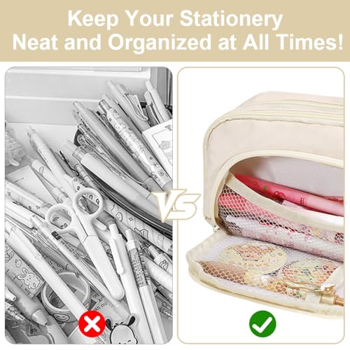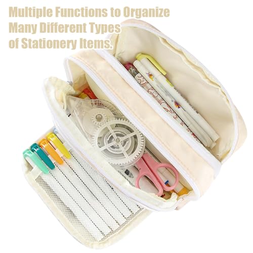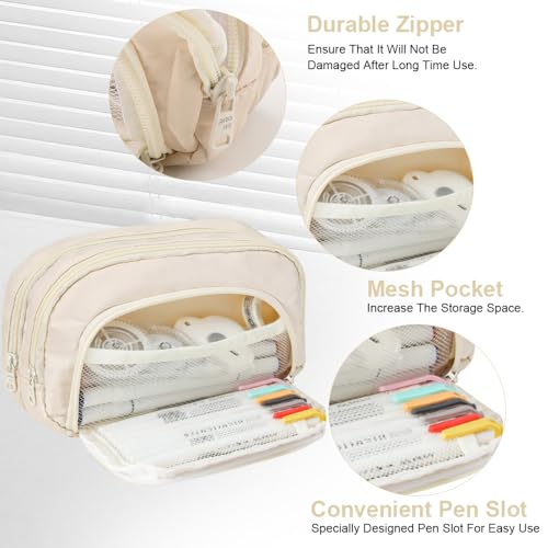 Federmäppchen Große Kapazität, Schulmäppchen Teenager mit 3 Schichten Und Geodreieck, Federtasche Erwachsene Beige, Etui Aesthetic, für Schule, BüRo, Mädchen, Jungen, Männer und Frauen