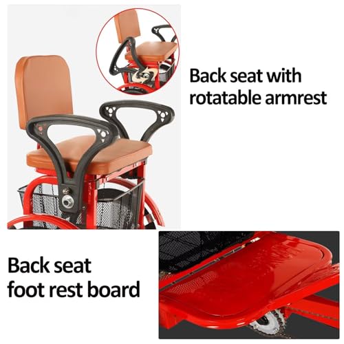 • 【Tandem-Dreirad】Es kann zwei Personen gleichzeitig transportieren. Der höhenverstellbare Lenker und Sattel ermöglichen eine einfache Anpassung an Fahrer unterschiedlicher Körpergröße. Der mit Leder umwickelte Schwammsattel und der Rücksitz sind bequem. Rücksitz mit hoher Rückenlehne, Seitengeländer und verbreiterter unterer Fußstütze.
