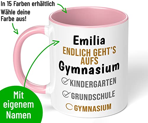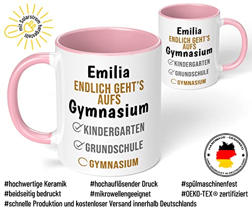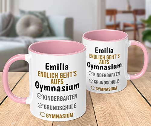 Geschenk Keramik-Tasse mit Namen „WUNSCHNAME Endlich geht’s aufs Gymnasium“ – Gymi Geschenk für Mädchen und Jungen (Rosa)