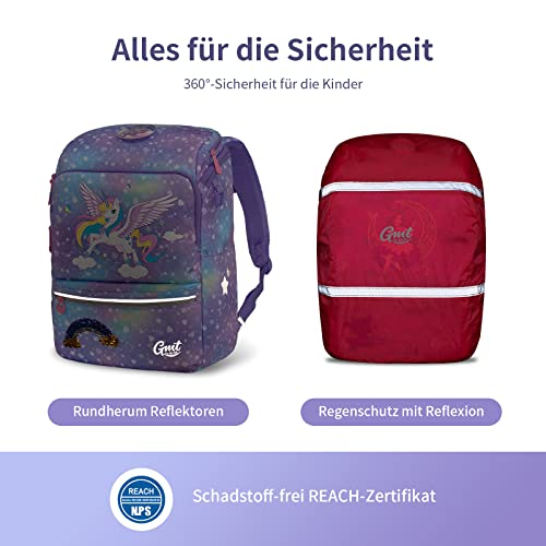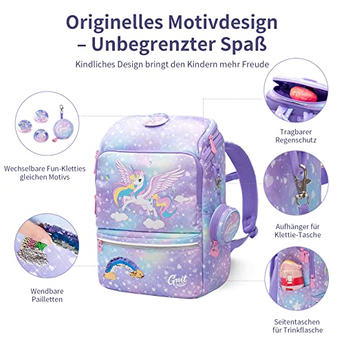 • 🌈🦄5-teiliges Set: GMT for Kids 5-teiliges Schulranzen-Set besteht aus 1x Schulranzen, 1x Schlampermäppchen, 1x Sportrucksack, 1x Regenschutz und 3x Fun-Kletties.