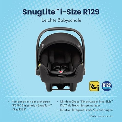 Graco SnugLite™ i-Size R129 Babyschale, ab Geburt bis ca. 12 Monate (40 bis 75 cm), leicht, kompatibel mit ISOFIX-Basisstation SnugTurn™ i-Size R129 (separat), Neugeboreneneinlage, schwarz, Midnight