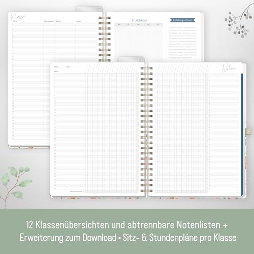 • DURCHDACHTE SCHULJAHRESPLANUNG – 12 Klassen- und Notenlisten plus Download-Erweiterung, Monats- und Jahresübersichten, Schulferien + Feiertage für DE und AT, Stundenpläne, Listen für Krankentage, Ausfallstunden, Vertretungs- und Zusatzstunden, Adressen u. v. m.
