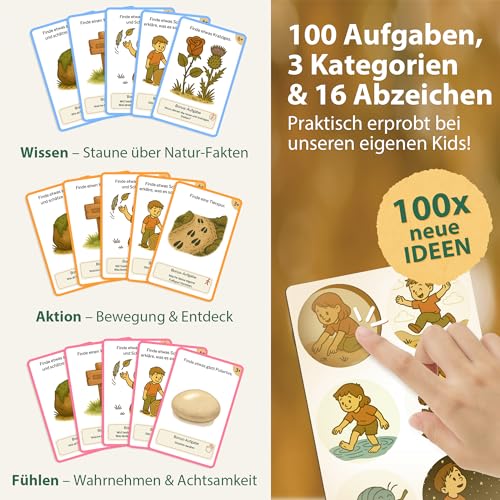 • 100 Aufgaben Abenteuer: 50 doppelseitige Entdeckerkarten verwandeln jeden Spaziergang in ein Outdoor Suchspiel für Kinder – spontane Beschäftigung ohne Vorbereitung, weg vom Bildschirm, rein ins Staunen