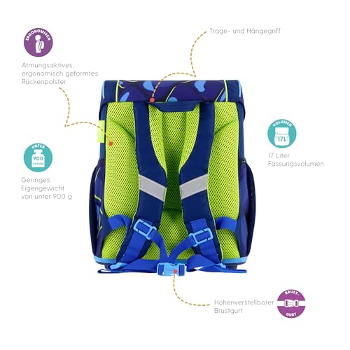 herlitz Schulranzen Set 4-teilig Loop T.Rex Explorer Blau Grün 17 L Ergonomischer Tornister mit geringem Gewicht 1. Klasse Junge Mädchen Kinder