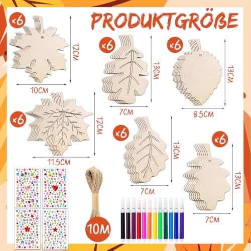 • 🍁 Herbst Basteln für Kinder: Das Paket enthält 36 Holzblätter, 12 Wasserfarben Stifte, 4 Diamantaufkleber und 1 Rolle Seil 10 Meter lang.