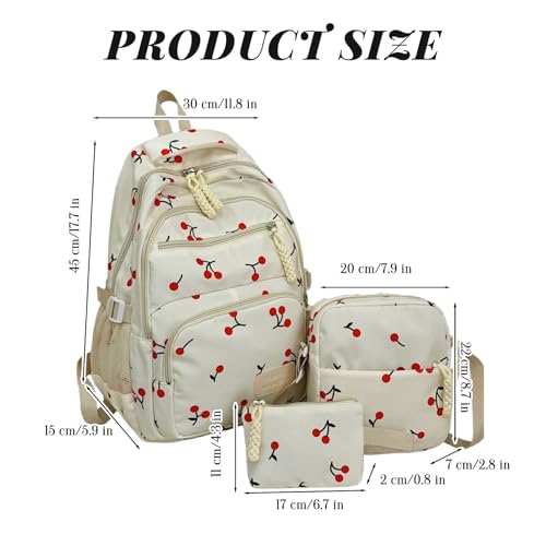 Joygoodta Cherry-Büchertasche, 3-teiliges Kirsch-Rucksack-Set für Mädchen, große Nylon-Büchertasche mit Messenger-Tasche und kleiner Tasche, ästhetischer Tagesrucksack, süßer Rucksack, weiß