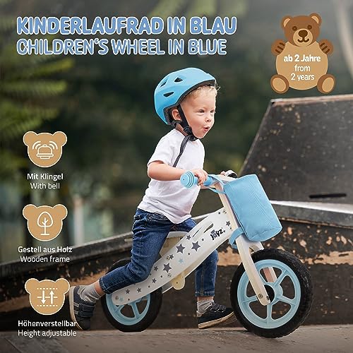 Joyz Laufrad aus Holz, Blau, Lauflernrad für Kinder ab 2 Jahren, Holzlaufrad mit verstellbarer Sitz, pannensicheren 11 Zoll-EVA-Räder, Kinderfahrrad Kinderlaufrad mit Stoffbeutel, Klingel & Tragegriff