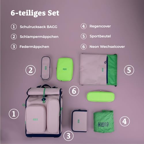 KWIO BAGG Schulranzen Set Pearl I 6 teilig, Roll-Top Design, Fronttaschen für Trinkflasche und Brotdose, Regencover, Retroreflektierende Beschichtung, ergonomisches Tragesystem, 1. Klasse