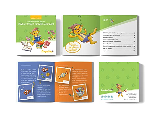 Lingufino Lernkarten Sprachförderung ab 3 Jahren – Bundle mit 90 Bildkarten: Einzahl-Mehrzahl, Reime & Verben – Logopädie Material für Kinder – inkl. Spielideen & Begleitheft zur Sprachentwicklung