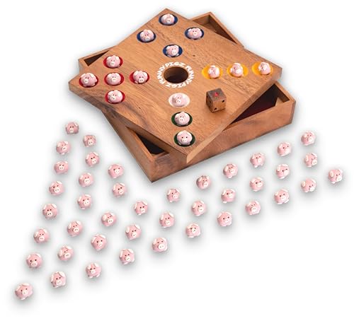 • BRETT-SPIEL MIT EDLEM HOLZ-KASTEN: Gewonnen hat bei diesem Holzspiel, wer zuerst durch Geschick und Würfel-Glück seine eigenen Keramik-Schweinchen los wird.