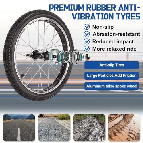 • Geländestabilität: Dieses Dreirad ist mit Luftreifen aus Gummi und Speichenrädern aus Aluminiumlegierung ausgestattet, um eine verbesserte Traktion an Hängen und Hügeln zu gewährleisten.