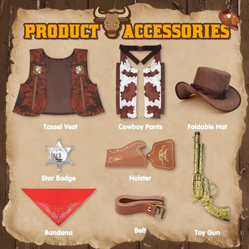• Cowboy Kostüm Kinder Set: Dieses fastnachtskostüme kinder kostüme enthält cowboy hut kinder jungen, eine cowboy weste kinder, eine Hose, ein Sheriff-Abzeichen, ein rotes Halstuch, einen Ledergürte und Accessoires. Erschaffen Sie ganz einfach einen kompletten Western-Cowboy-Look für karneval kostüm kinder jungen!
