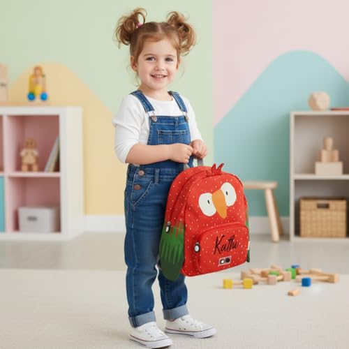 Mainely Personalisierter Kindergartenrucksack – Papagei – verstellbare Träger & Brustgurt – optional mit Trinkflasche – Kita-Rucksack ab 1 Jahr – personalisiert mit Namen – Trixie