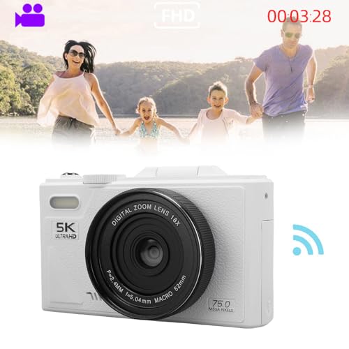 MENDUNER 5K Digitalkamera für Fotografie, 75 MP und 18 facher Zoom mit WLAN, 3 Zoll Bildschirm, Anfänger, Anti Shake Vlog Kamera für Kinder (White)