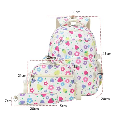 NihaoWXM Schulrucksack Set 3 Stück modische Rucksäcke mit Lunchtasche, Federmäppchen, Tagesrucksack for die Grundschule, Rucksack Erdbeerdruck(Purple)