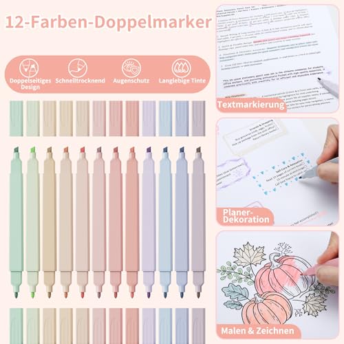 • ✏️ 【Pastell Doppelspitz Textmarker】12 mehrfarbige textmarker mit feiner und breiter Spitze für präzises Markieren. Die weichen Farben sind augenfreundlich, auslaufsicher und gleiten leicht über das Papier. Ideal für Notizen, Studium und Zeitplanung!