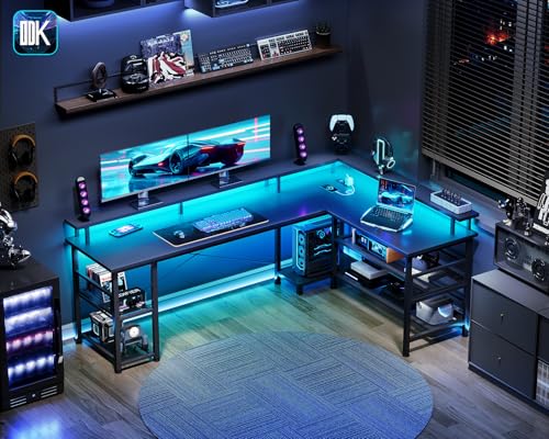 ODK Gaming Tisch mit LED, 168×120cm Reversibel Gaming Schreibtisch mit 2 Steckdosen & 2 USB-Ladeanschlüssen, Eckschreibtisch Groß mit Netzablage, Kohlefaser Schwarz
