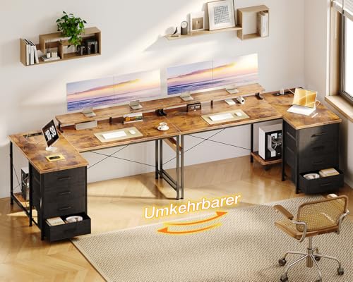 ODK Schreibtisch L Form, 140x80x84.7cm Eckschreibtisch Reversibel mit 4 Schubladen&Monitorablage, Tisch L Form mit 2 USB-Ladeanschluss&2 Steckdose für Homeoffice, Braun