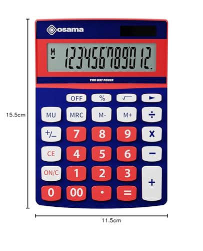 Osama – Büro-Taschenrechner Groß, mit 12 Ziffern, 3 Speichertasten und doppelter Stromversorgung – Professioneller Rechner mit Mark up für Arbeit und Universität, 3,6 x 11,5 x 15,5 cm, Hellblau/Orange