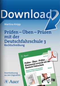 Sie erhalten Tests zur Lernstandserfassung sowie passgenaue Übungsblätter mit denen Sie Ihre Schüler bezüglich der Kernthemen im Deutschunterricht der 3. Klasse gezielt fördern können. Das vorliegende Material behandelt das Thema Rechtschreibung. Die Tests haben ein spezielles Führerscheinlayout mit Multiple-Choice-Fragen und einem abtrennbaren Kontrollstreifen am Rand. So können die Lösungen ohne großen Aufwand ermittelt werden. Auch eine Selbstkontrolle durch die Kinder ist möglich. Gleichzeitig motiviert die Methode der Fahrschule die Schülerinnen und Schüler, sich zu verbessern und Lernfortschritte zu erzielen. Zuerst ermitteln Sie den Lernstand in einem Thema. Anschließend findet die Übungsphase statt, in der anhand von Arbeitsblättern gezielt einzelne Bereiche gefördert werden. Danach folgt die eigentliche Führerscheinprüfung. Die Themen im Überblick:Wörter mit ie | Wörter mit b am Ende | Wörter mit d am Ende | Wörter mit g am Ende | Wörter mit St/st | Wörter mit Sp/sp