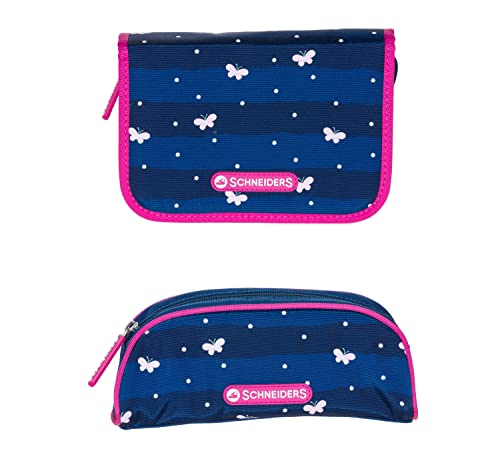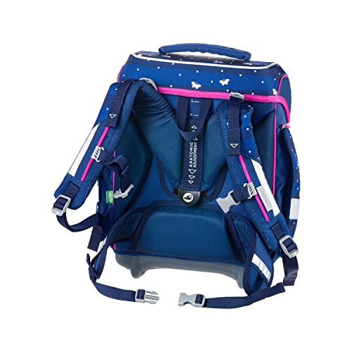 • Komplett-Set bestehend aus Schulranzen, Faulenzer, Federmappe (nicht befüllt), Turnbeutel, 3 Patches (Schmetterling, Pailletten-Herz, Basic), 2 Leuchtstäben, in Dunkelblau mit Schmetterling-Motiv, der ideale Wegbegleiter ab der ersten Klassenstufe